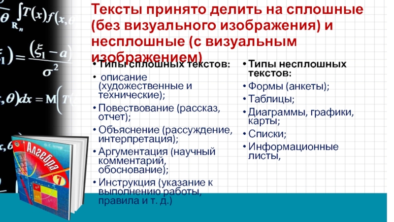 Слайд 5Тексты принято делить на сплошные (без визуального изображения) и несплошные (с