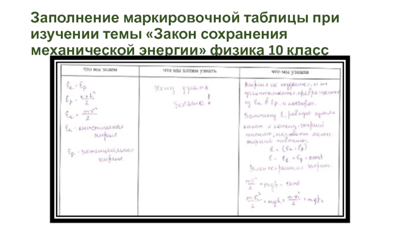 Слайд 20Заполнение маркировочной таблицы при изучении темы «Закон сохранения механической энергии» физика