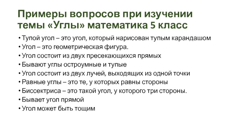 Слайд 13Примеры вопросов при изучении темы «Углы» математика 5 класс