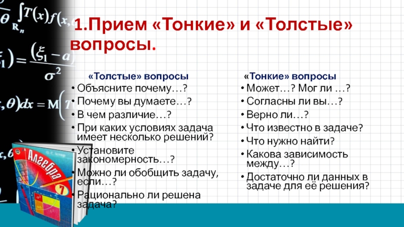 Слайд 6 1.Прием «Тонкие» и «Толстые» вопросы.