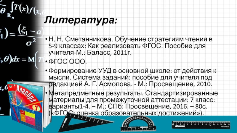 Формирование УУД в основной школе: от действия к мысли. Система заданий: пособие для учителя под редакцией А. Г. Асмолова. - М.: Просвещение, 2010.