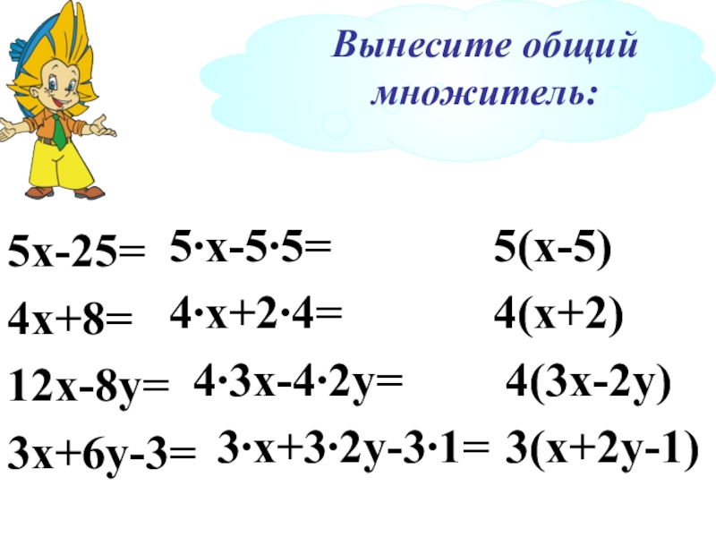 Вынесите общий множитель:5х-25=4х+8=12х-8у=3х+6у-3=5∙х-5∙5=4∙х+2∙4= 4∙3х-4∙2у=  3∙х+3∙2у-3∙1=    5(х-5)  4(х+2)  4(3х-2у)  3(х+2у-1)