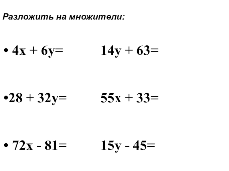 Разложить на множители: 4х + 6у=28 + 32у= 72х - 81=14у + 63=55х + 33=15у - 45=