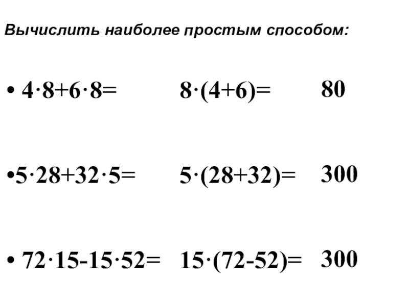 Вычислить наиболее простым способом: 4·8+6·8=5·28+32·5= 72·15-15·52=8·(4+6)=5·(28+32)=15·(72-52)=80 300300