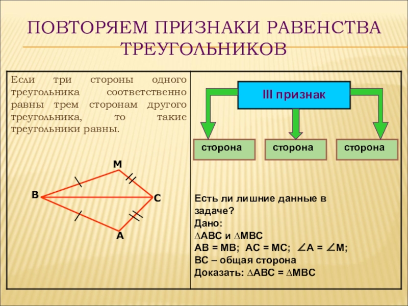 ПОВТОРЯЕМ ПРИЗНАКИ РАВЕНСТВА ТРЕУГОЛЬНИКОВ  III признаксторонасторонасторонаАСВМЕсть ли лишние данные в задаче?Дано:∆АВС и ∆МВС АВ = МВ;