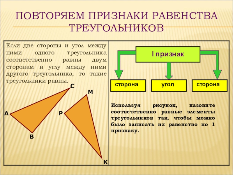 ПОВТОРЯЕМ ПРИЗНАКИ РАВЕНСТВА ТРЕУГОЛЬНИКОВ  I признаксторонауголсторонаАСВРМКИспользуя рисунок, назовите соответственно равные элементы треугольников так, чтобы можно было