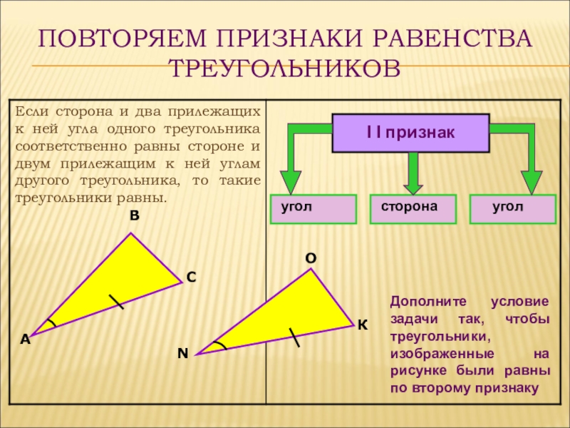 ПОВТОРЯЕМ ПРИЗНАКИ РАВЕНСТВА ТРЕУГОЛЬНИКОВ  I I признакуголсторона  уголАСВONКДополните условие задачи так, чтобы треугольники, изображенные на