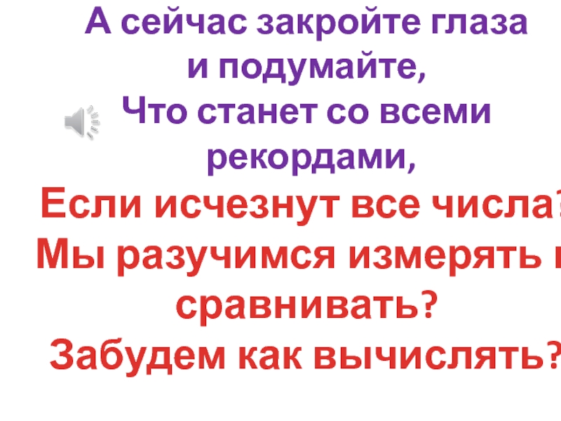 А сейчас закройте глазаи подумайте,Что станет со всеми рекордами,Если исчезнут все числа?Мы разучимся измерять и сравнивать?Забудем как