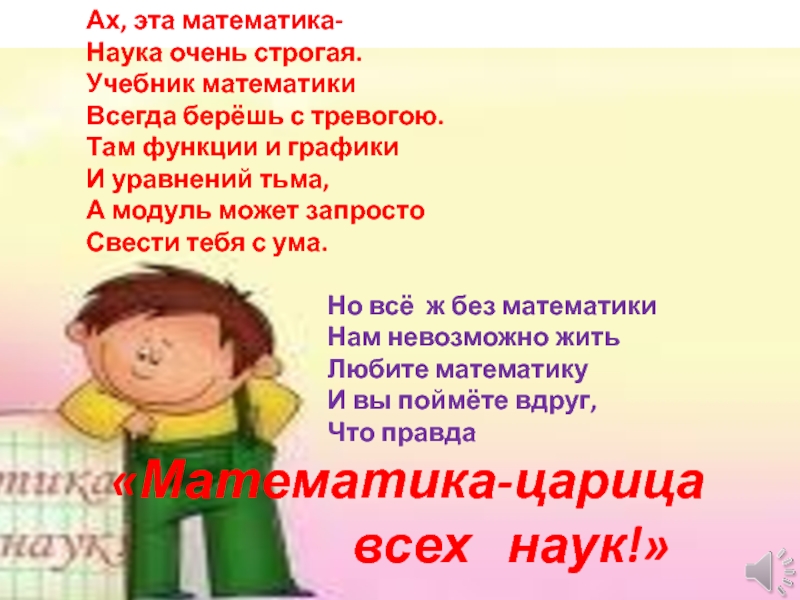 Ах, эта математика-Наука очень строгая.Учебник математикиВсегда берёшь с тревогою.Там функции и графики И уравнений тьма,А модуль может