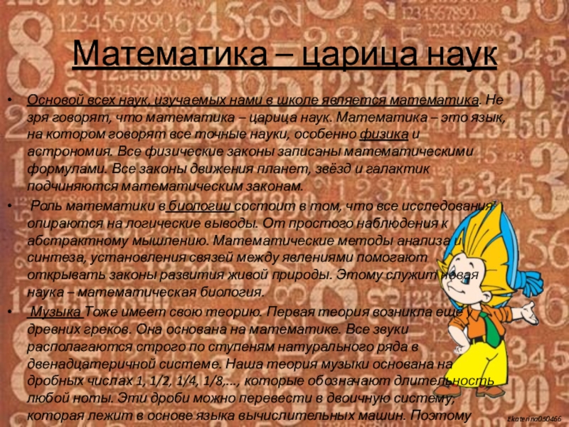 Музыка Тоже имеет свою теорию. Первая теория возникла ещё y древних греков. Она основана на математике. Все звуки располагаются строго по ступеням натурального ряда в двенадцатеричной системе. Наша теория музыки основана на дробных числах 1, 1/2, 1/4, 1/8,..., которые обозначают длительность любой ноты. Эти дроби можно перевести в двоичную систему, которая лежит в основе языка вычислительных машин. Поэтому музыку могут писать и математические машины.