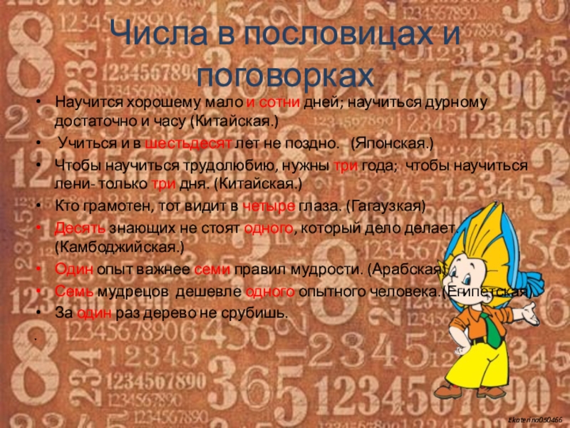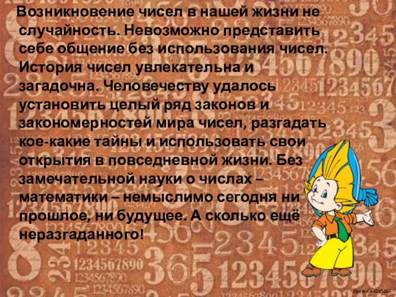 представить себе общение без использования чисел. История чисел увлекательна и загадочна. Человечеству удалось установить целый ряд законов и закономерностей мира чисел, разгадать кое-какие тайны и использовать свои открытия в повседневной жизни. Без замечательной науки о числах – математики – немыслимо сегодня ни прошлое, ни будущее. А сколько ещё неразгаданного!