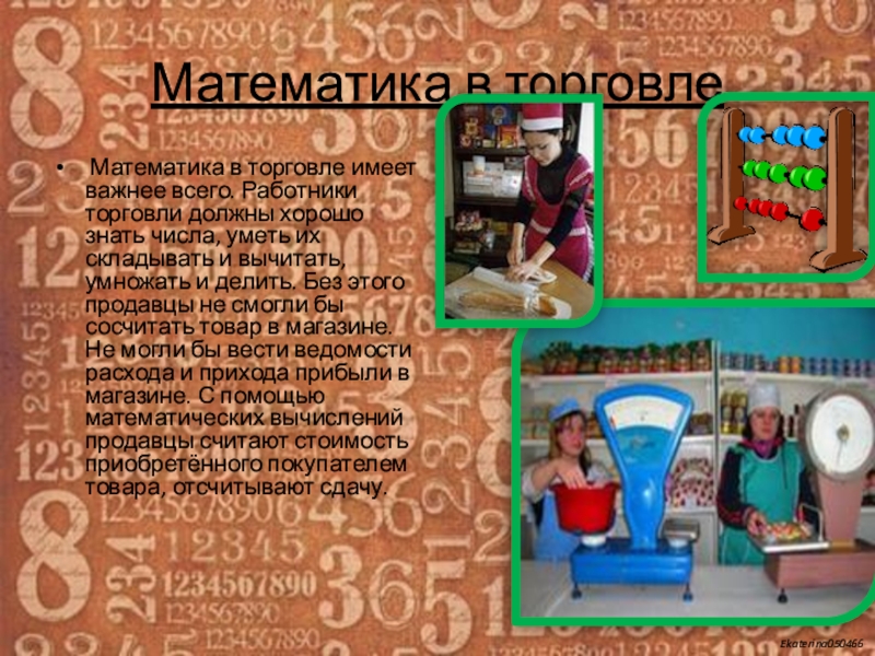 должны хорошо знать числа, уметь их складывать и вычитать, умножать и делить. Без этого продавцы не смогли бы сосчитать товар в магазине. Не могли бы вести ведомости расхода и прихода прибыли в магазине. С помощью математических вычислений продавцы считают стоимость приобретённого покупателем товара, отсчитывают сдачу.