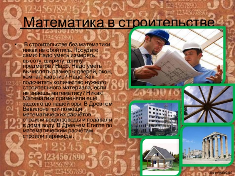 Посудите сами: Надо уметь измерять высоту, ширину, длину предметов? Надо. Надо уметь вычислять размеры дверей, окон, комнат, квартир? Надо. Как подсчитать количество нужного строительного материала, если не знаешь математику? Никак! Математику применяли ещё задолго до нашей эры. В Древнем Вавилоне при помощи математических расчётов строили водопроводы и подавали в дома воду. В Древнем Египте по математическим расчётам строили пирамиды.