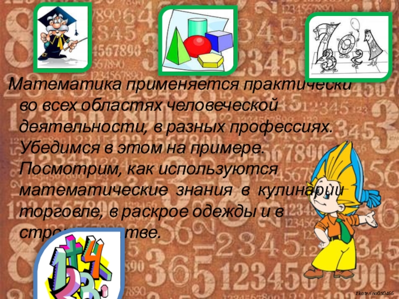 применяется практически во всех областях человеческой деятельности, в разных профессиях. Убедимся в этом на примере. Посмотрим, как используются математические знания в кулинарии торговле, в раскрое одежды и в строительстве.