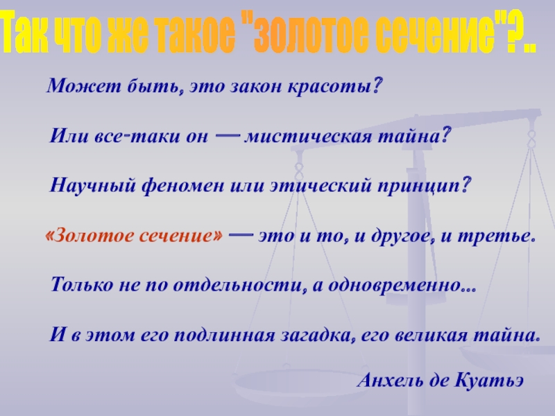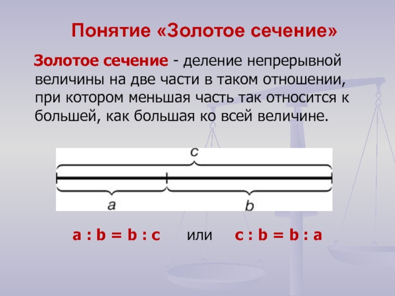 Золотое сечение - деление непрерывной величины на две части в таком отношении, при котором меньшая часть так относится к большей, как большая ко всей величине.