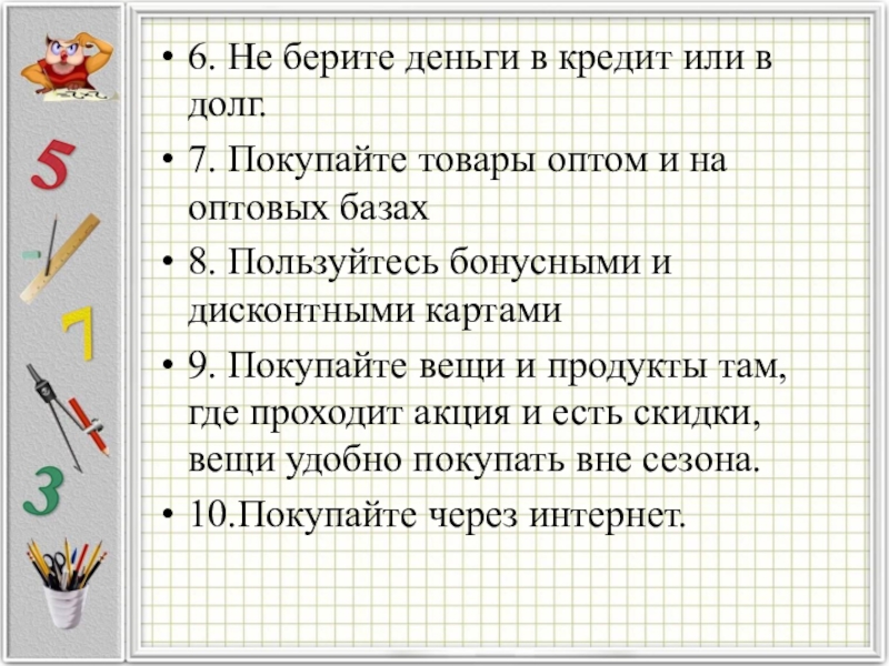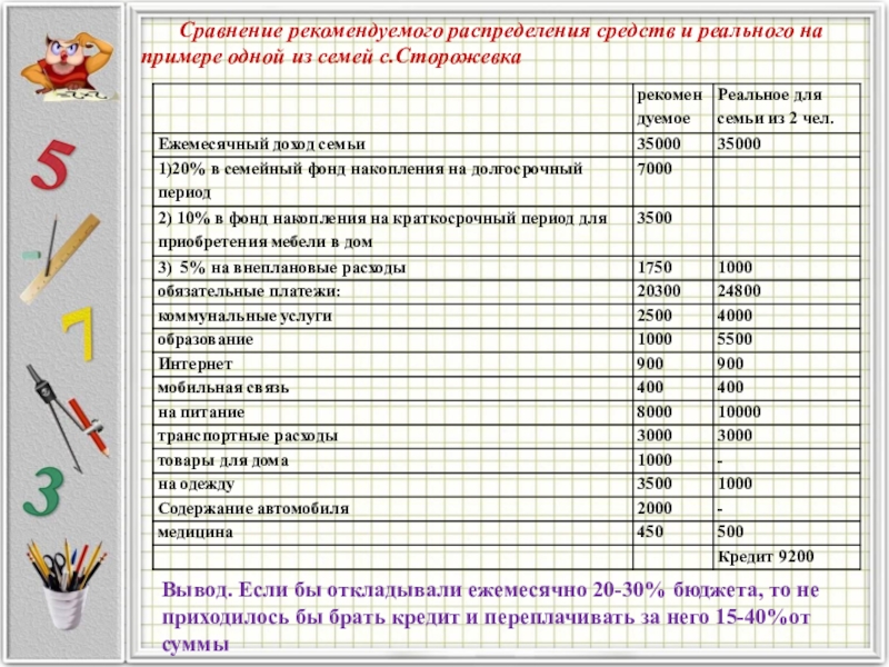 Вывод. Если бы откладывали ежемесячно 20-30% бюджета, то не приходилось бы брать кредит и переплачивать за него 15-40%от суммы