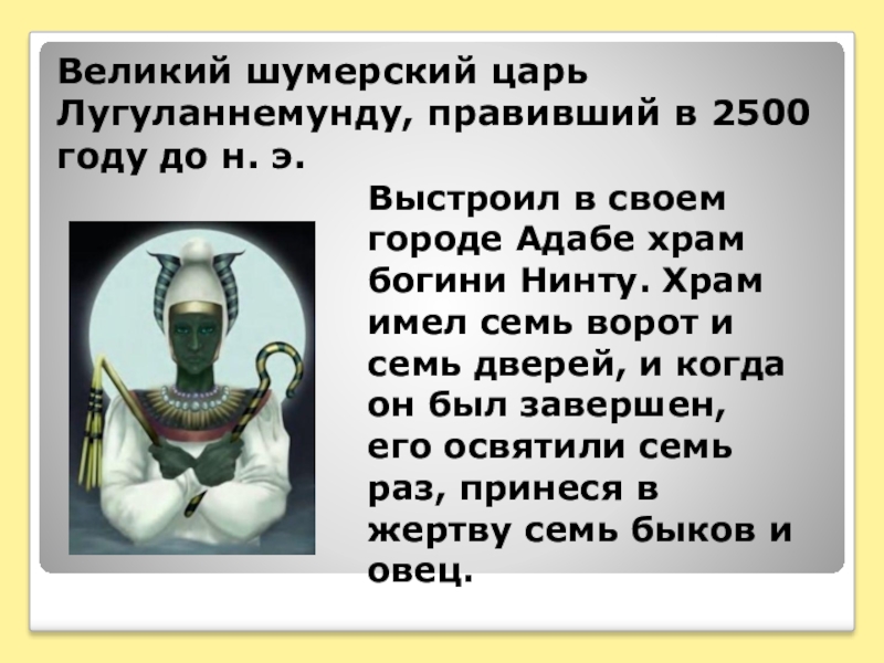 Выстроил в своем городе Адабе храм богини Нинту. Храм имел семь ворот и семь дверей, и когда он был завершен, его освятили семь раз, принеся в жертву семь быков и овец.