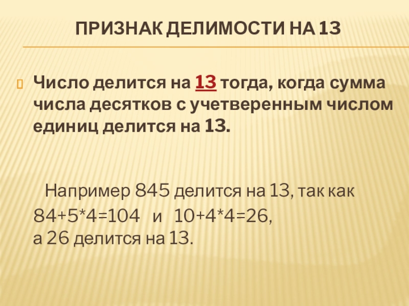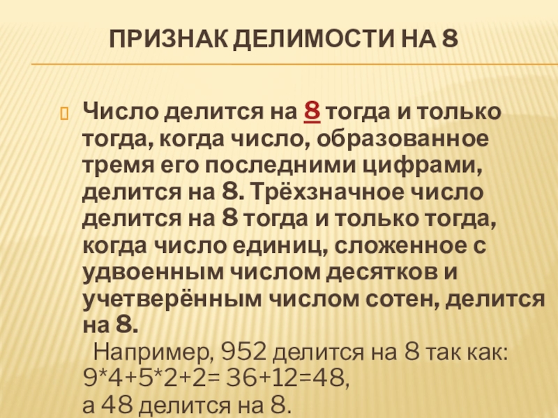когда число, образованное тремя его последними цифрами, делится на 8. Трёхзначное число делится на 8 тогда и только тогда, когда число единиц, сложенное с удвоенным числом десятков и учетверённым числом сотен, делится на 8.