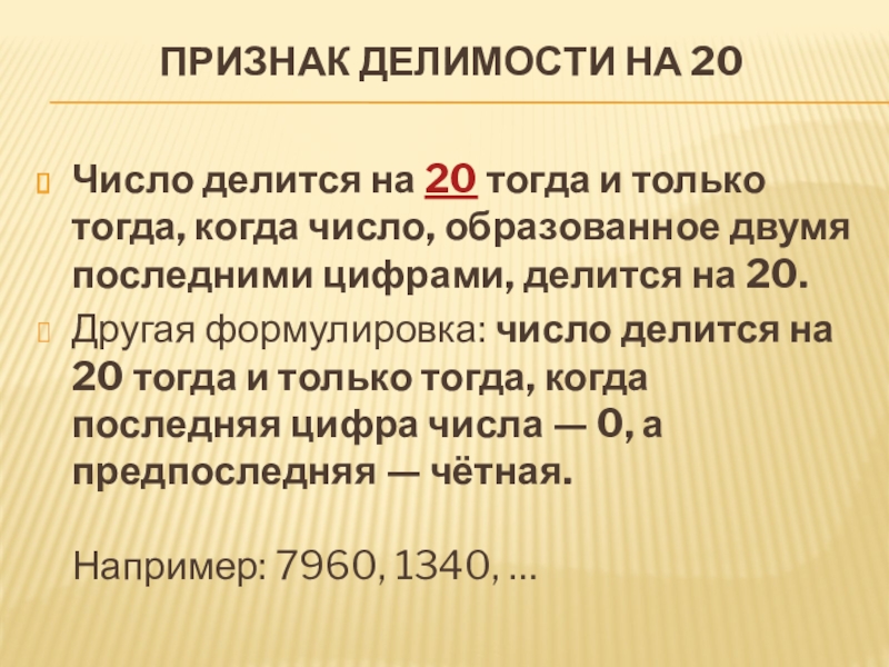 Другая формулировка: число делится на 20 тогда и только тогда, когда последняя цифра числа — 0, а предпоследняя — чётная.