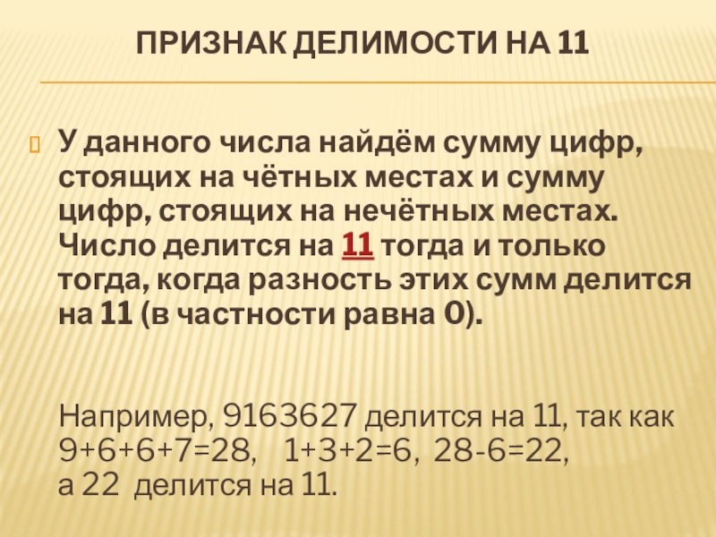 Например, 9163627 делится на 11, так как 9+6+6+7=28, 1+3+2=6, 28-6=22,