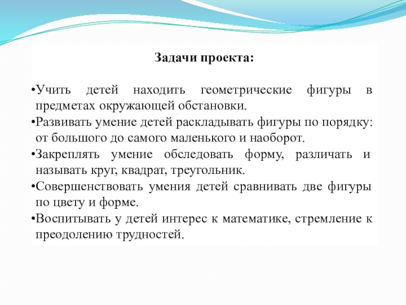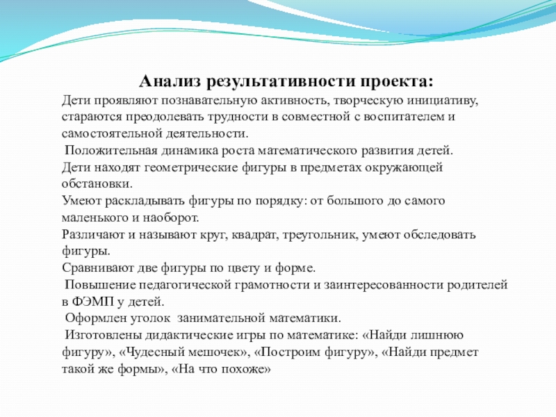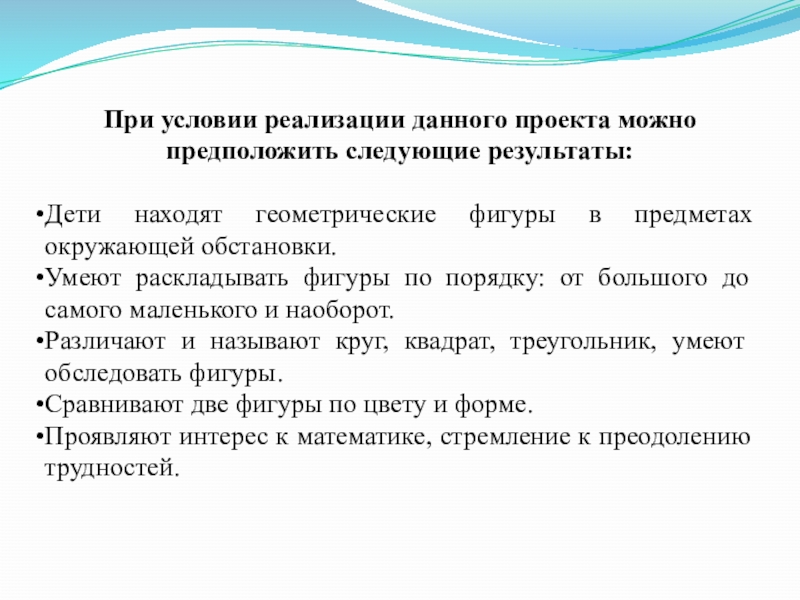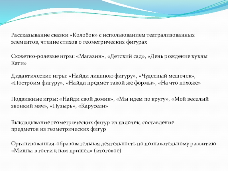 Дидактические игры: «Найди лишнюю фигуру», «Чудесный мешочек», «Построим фигуру», «Найди предмет такой же формы», «На что похоже»