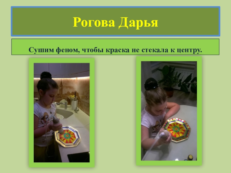Рогова ДарьяСушим феном, чтобы краска не стекала к центру.