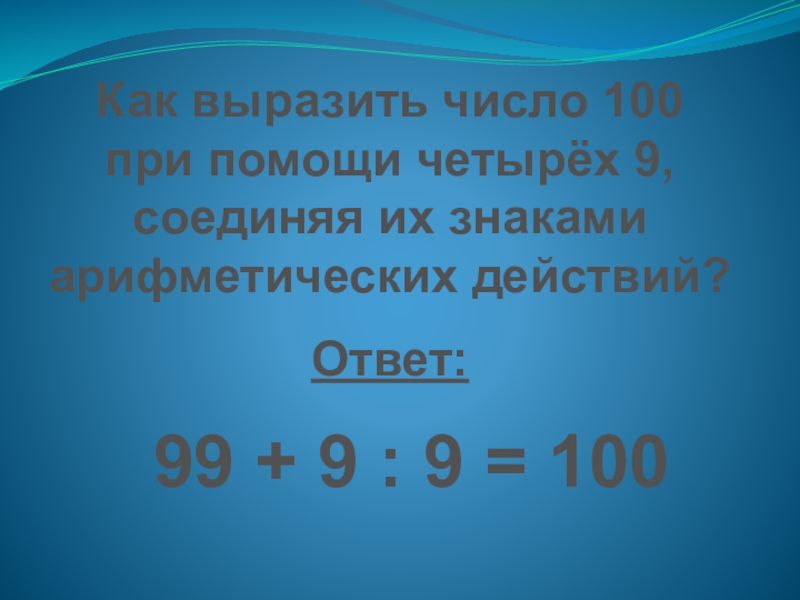 Как выразить число 100 при помощи четырёх 9, соединяя их знакамиарифметических действий? Ответ:99 + 9 : 9