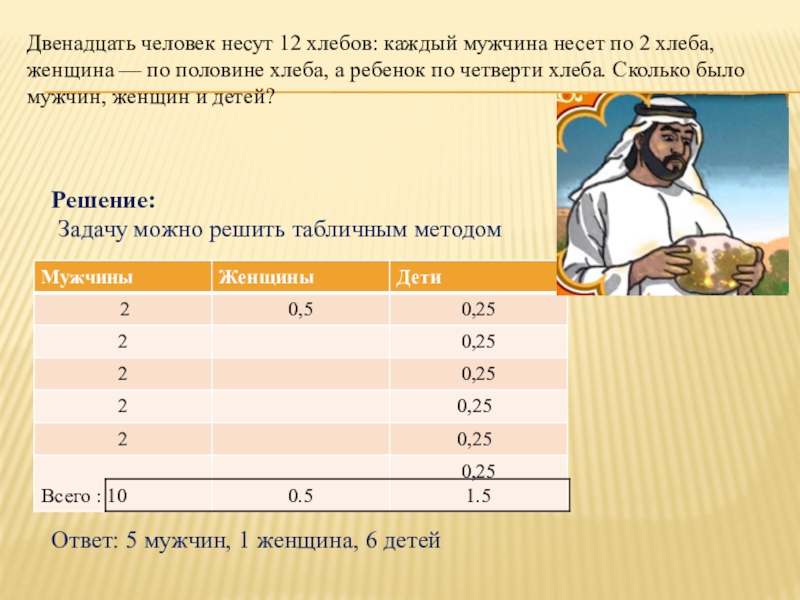 Ответ: 5 мужчин, 1 женщина, 6 детей