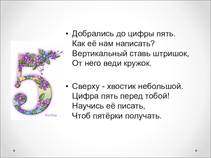 Сверху - хвостик небольшой. Цифра пять перед тобой! Научись её писать, Чтоб пятёрки получать.