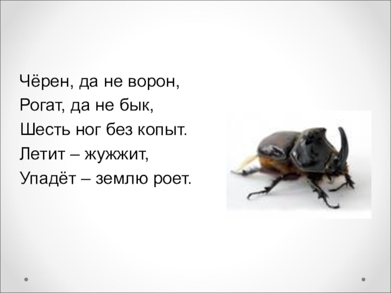 Чёрен, да не ворон,Рогат, да не бык,Шесть ног без копыт.Летит – жужжит,Упадёт – землю роет.