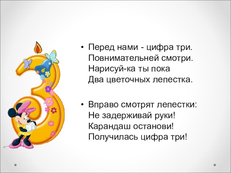 Перед нами - цифра три. Повнимательней смотри. Нарисуй-ка ты пока Два цветочных лепестка.Вправо смотрят лепестки: Не задерживай