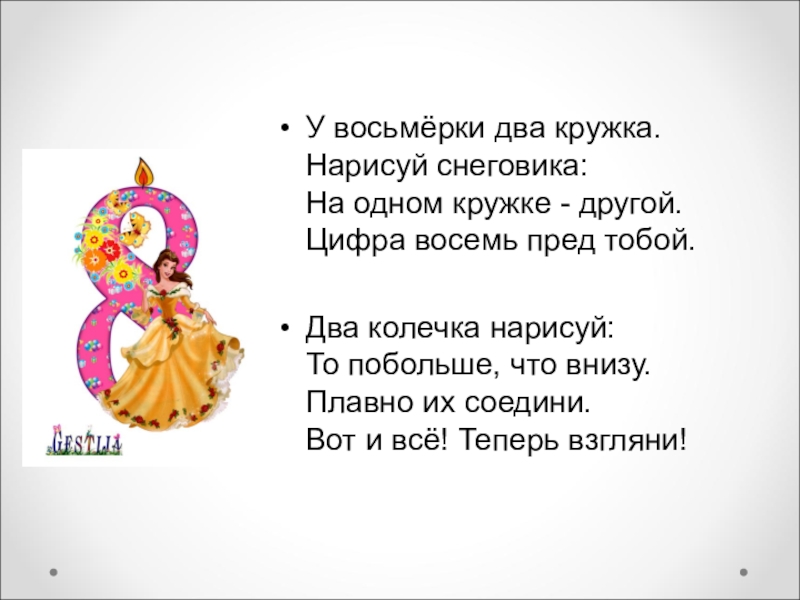 У восьмёрки два кружка. Нарисуй снеговика: На одном кружке - другой. Цифра восемь пред тобой.Два колечка нарисуй: