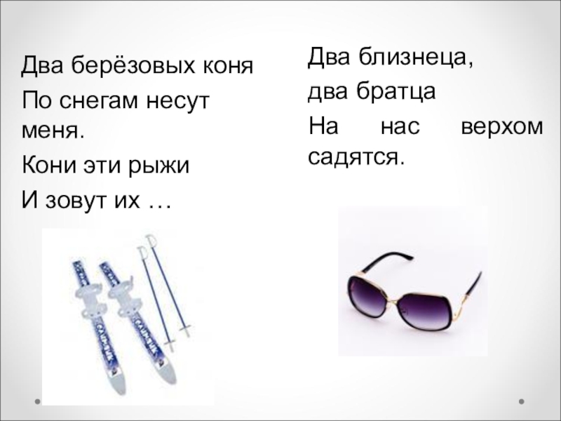 Два близнеца, два братцаНа нас верхом    садятся.Два берёзовых коняПо снегам несут меня.Кони эти рыжиИ