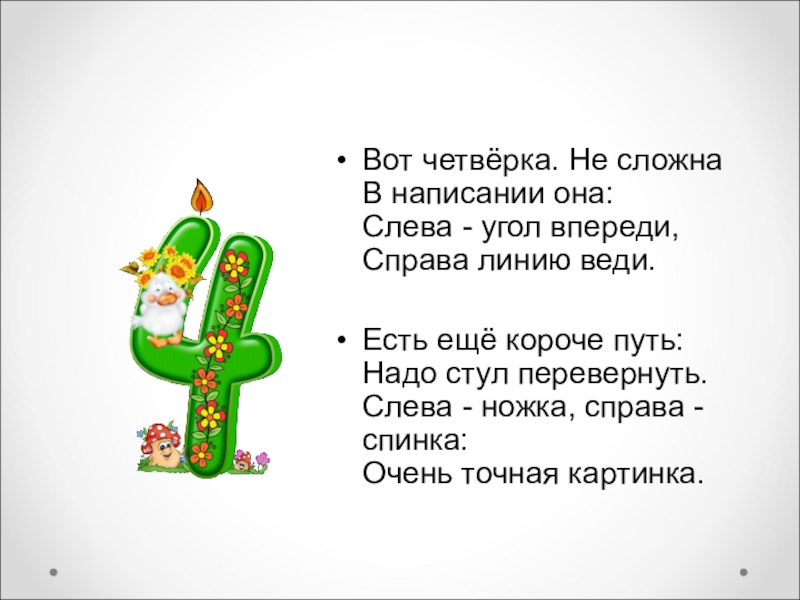 Вот четвёрка. Не сложна В написании она: Слева - угол впереди, Справа линию веди.