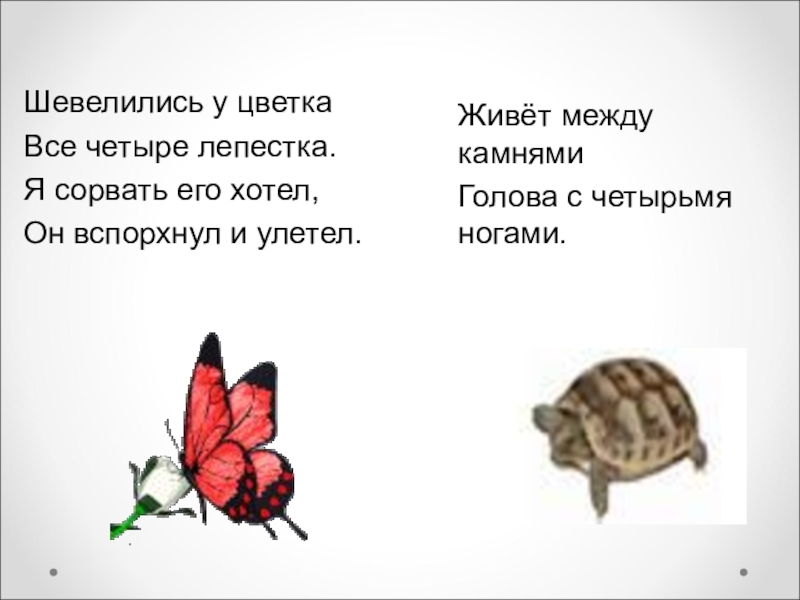 Живёт между камнямиГолова c четырьмя ногами.Шевелились у цветкаВсе четыре лепестка.Я сорвать его хотел,Он вспорхнул и улетел.