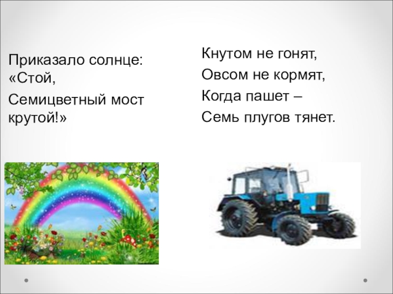 Кнутом не гонят,Овсом не кормят,Когда пашет –Семь плугов тянет.Приказало солнце: «Стой,Семицветный мост крутой!»