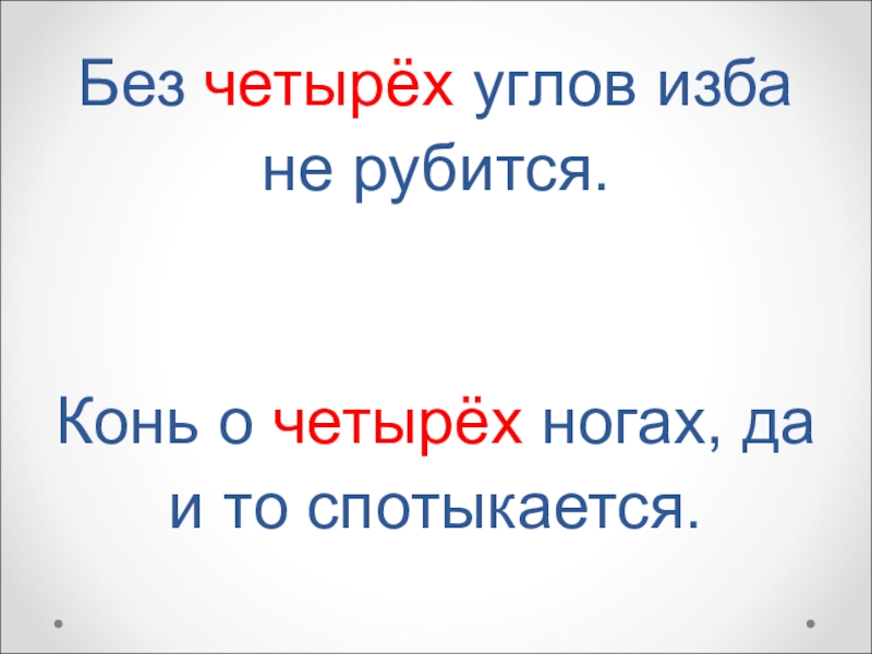 Слайд 14Без четырёх углов изба не рубится. Конь о четырёх ногах, да и