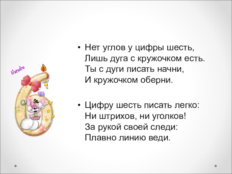 Нет углов у цифры шесть, Лишь дуга с кружочком есть. Ты с дуги писать начни, И кружочком