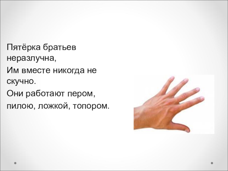 Пятёрка братьев неразлучна, Им вместе никогда не скучно.Они работают пером, пилою, ложкой, топором.