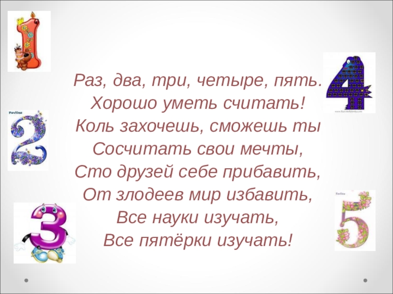 Раз, два, три, четыре, пять.Хорошо уметь считать!Коль захочешь, сможешь тыСосчитать свои мечты,Сто друзей себе прибавить,От злодеев мир избавить, Все науки изучать,Все пятёрки изучать!