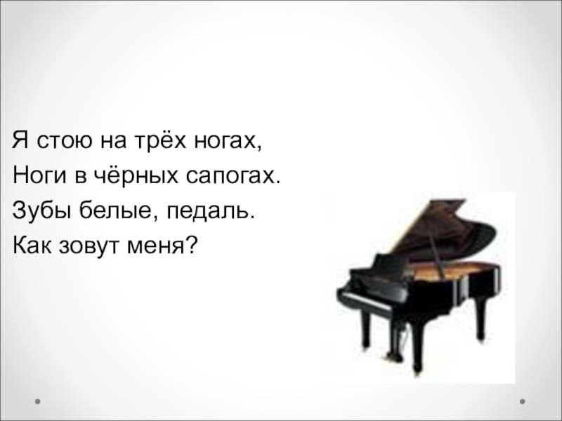 Я стою на трёх ногах,Ноги в чёрных сапогах.Зубы белые, педаль.Как зовут меня?