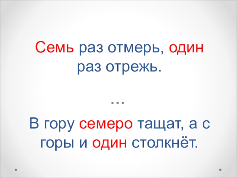Слайд 22Семь раз отмерь, один раз отрежь. В гору семеро тащат, а с