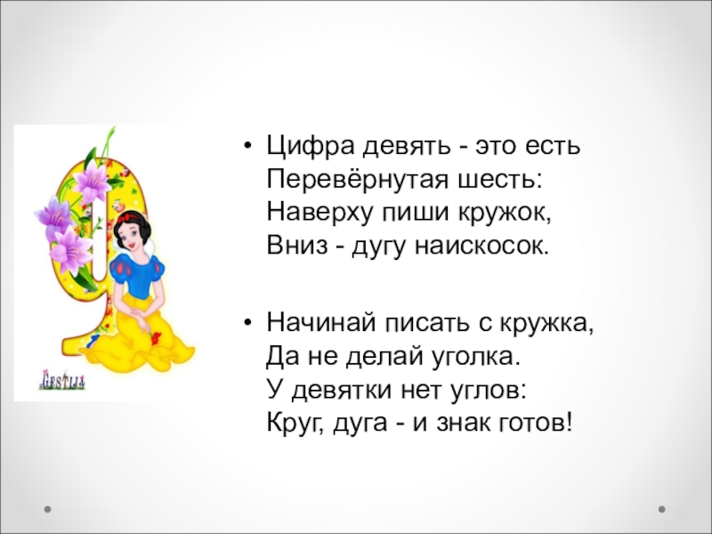 Цифра девять - это есть Перевёрнутая шесть: Наверху пиши кружок, Вниз - дугу наискосок.Начинай писать с кружка,