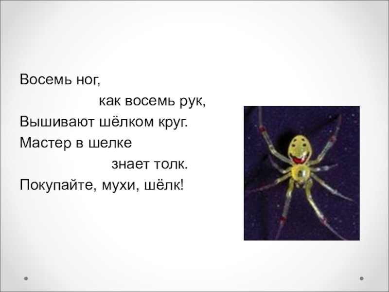 Восемь ног,          как восемь рук,Вышивают шёлком круг.Мастер в