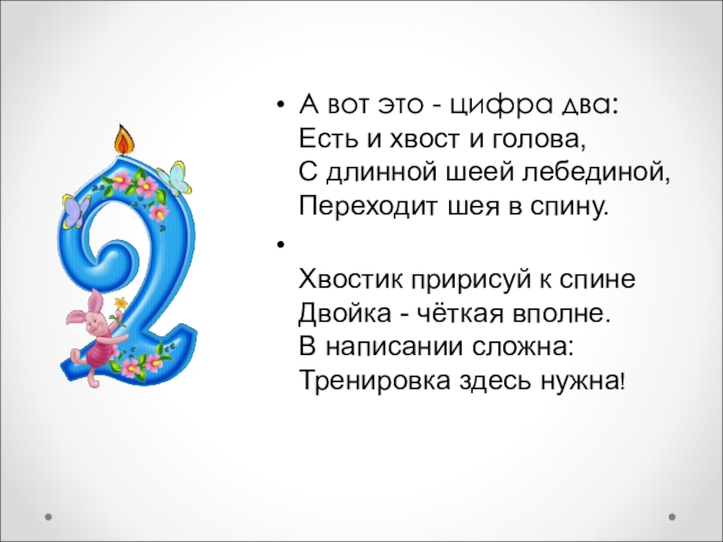 А вот это - цифра два: Есть и хвост и голова, С длинной шеей лебединой, Переходит шея