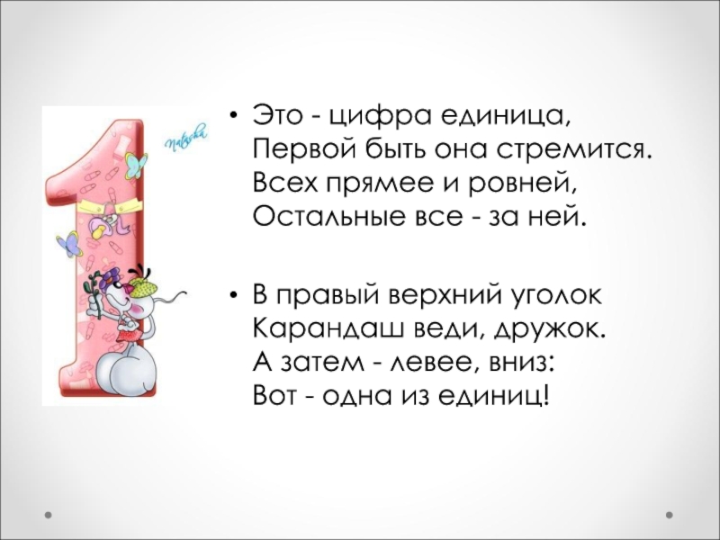 В правый верхний уголок Карандаш веди, дружок. А затем - левее, вниз: Вот - одна из единиц!