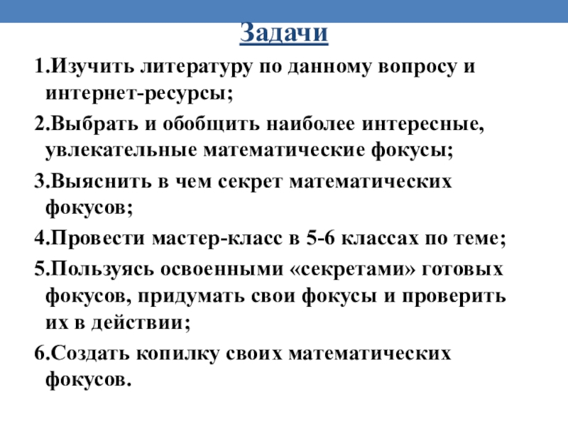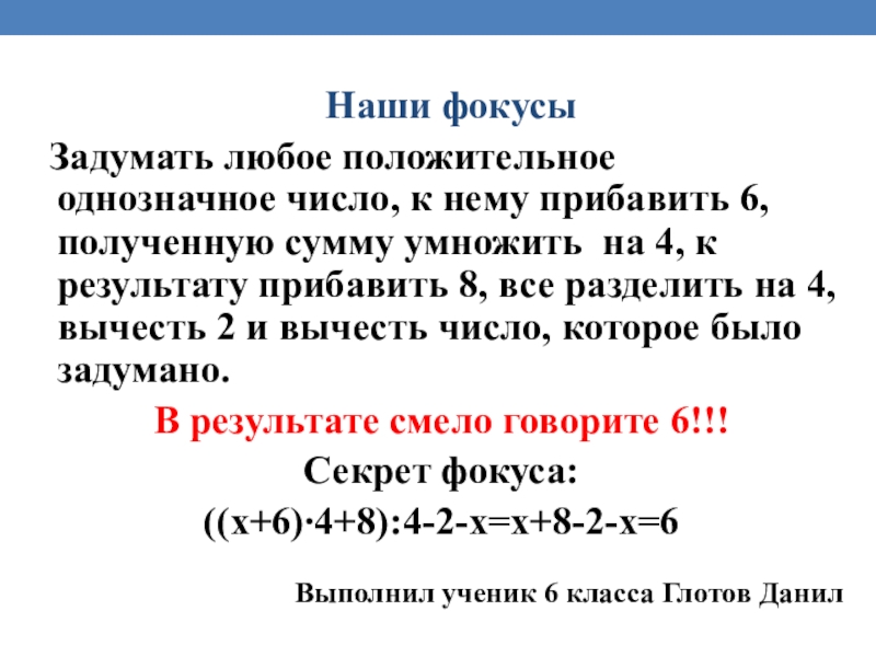 Слайд 6 Объект исследования: математические фокусы, основанные на свойствах чисел, действий, математических