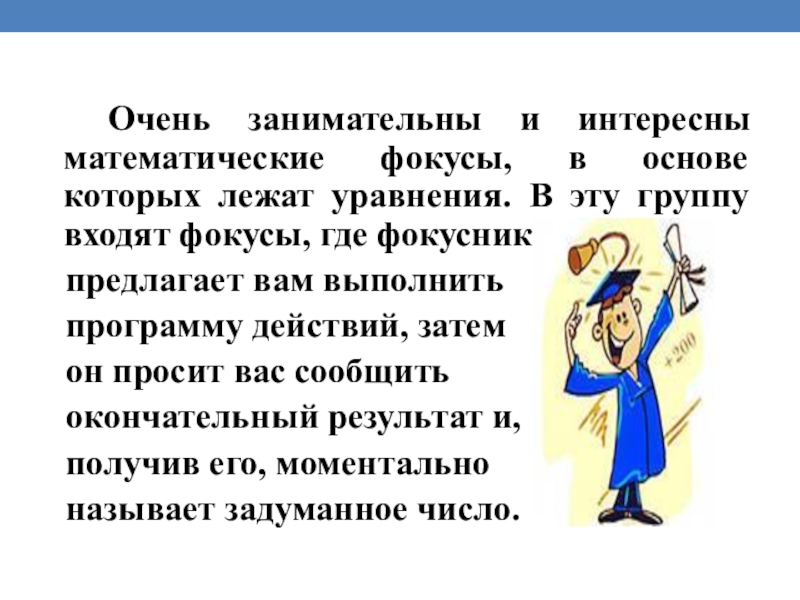лежат уравнения. В эту группу входят фокусы, где фокусник