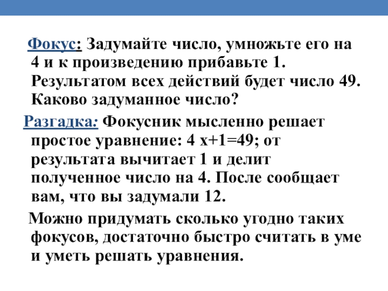 Разгадка: Фокусник мысленно решает простое уравнение: 4 х+1=49; от результата вычитает 1 и делит полученное число на 4. После сообщает вам, что вы задумали 12.