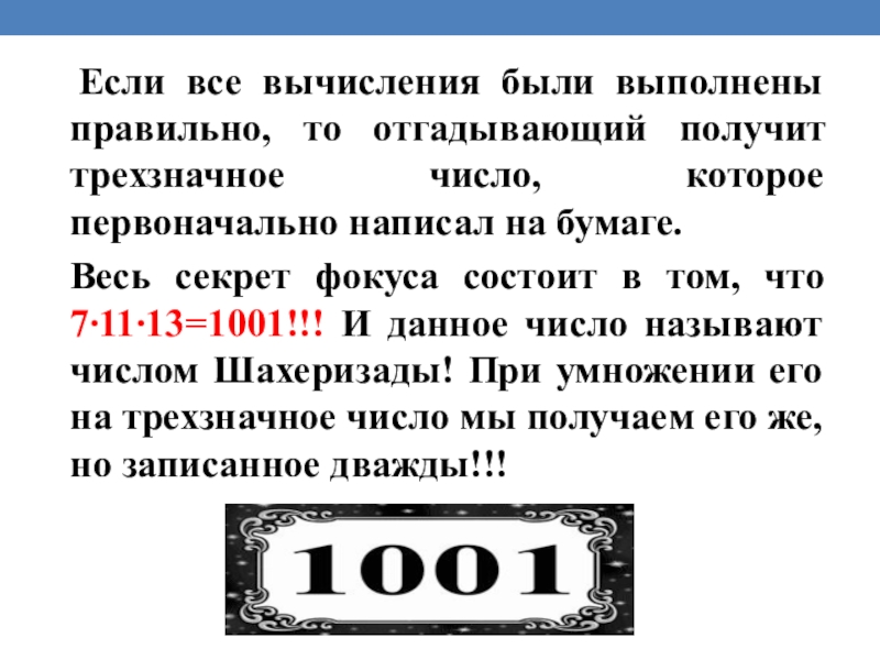 Весь секрет фокуса состоит в том, что 7∙11∙13=1001!!! И данное число называют числом Шахеризады! При умножении его на трехзначное число мы получаем его же, но записанное дважды!!!